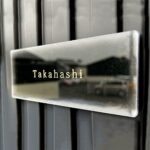 アクリル製の長方形表札で、金箔文字仕様。戸建て、マンション、アパート向け。サイズは180×72mm、カラーはマットブラック。明朝体で上品な印象を演出。