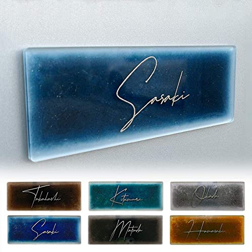 アクリル表札の長方形デザイン。サイズは180×72mm、サファイヤブルーの背景に銀箔文字、戸建てやマンション、アパートに最適。筆記体No1でおしゃれなネームプレート。