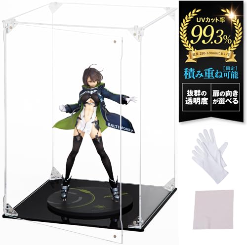 HYPE GUARDのフィギュアケースは、UVカット99.3%のアクリル製で、積み重ね可能。マグネット付きの前扉により、コレクションを美しくディスプレイ。内寸は幅25×奥行25×高さ35cm、台座は黒です。