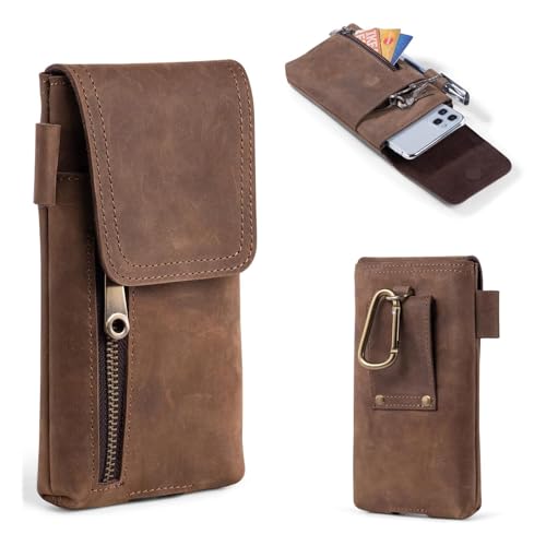 HUAZHIMAO本革製スマホホルダー。ベルト通し付きで、HUAWEI/iPhone/Samsung Galaxy/Xperiaに対応。便利なペンホルダー付きのレトロブラウンポーチは、小型で腰に装着可能です。