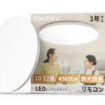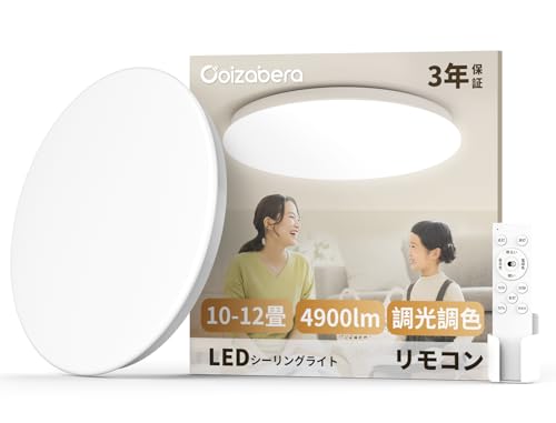 Coizabera LEDシーリングライトは10畳-12畳に適合し、38Wで4900lmの高輝度。調光調色機能と常夜灯があり、リモコン付き。薄型デザインで、寝室やリビングに最適。