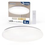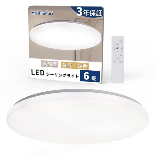 Hoshiakariの薄型LEDシーリングライトは6畳用で、高輝度3600lm、12段階の調光・調色が可能です。常夜灯、タイマー、メモリー機能付き。取り付け簡単で、リビングや寝室に最適。赤外線リモコン付き。