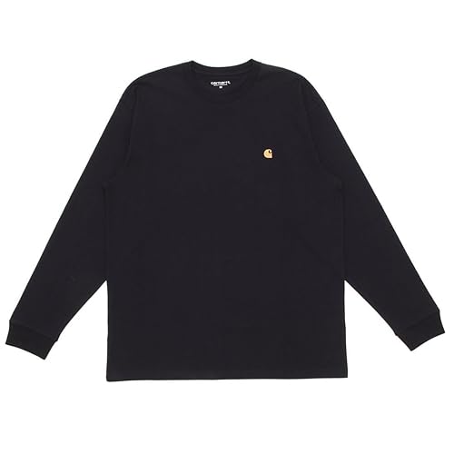 カーハートのロングスリーブチェイスTシャツ。ダークネイビーにゴールドのロゴが映えるデザインで、メンズ・レディース共用。快適な着心地でスタイルもキープ。サイズXL。