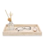 ELLDOOのナチュラルベージュのトラバーチン大理石製化粧台トレイ。香水やジュエリー、キャンドル用の高級装飾トレイで、バスルームやナイトスタンド、省スペースのキッチンバーカウンターに最適です。サイズは11.8×7.8インチ。