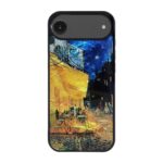 ikins iPhone Air用の天然貝ケース、ゴッホ「夜のカフェテラス」デザイン。表面コーティングで高耐久、防塵性を備え、ハイブリッドフレーム、ストラップホール付き、無線充電にも対応。