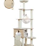 YUCHONGのキャットタワーは、多頭飼いに最適な木製の据え置き型。高さ155cmでスリムなデザイン、透明ボウルや宇宙船付き。爪とぎポールや掃除が簡単で安定性も高く、運動不足解消に最適です。