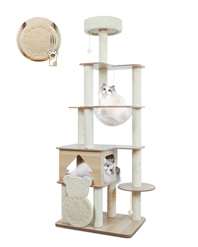 YUCHONG キャットタワー 多頭飼い 木製 猫タワー スリム 大型猫用 据え置き型 高さ155cm見晴台 透明ボウル 宇宙船付き天然サイザル麻 爪とぎポール 猫の家 人気 おしゃれ 春夏秋冬 掃除簡単 安定性 省スペース 運動不足解消 高価買取中