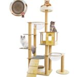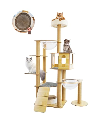YUCHONGキャットタワーは、大型猫向けの木製で、宇宙船デザイン。滑り止めマット付きで安定感あり、多頭飼いにも最適。高さ147cm、天然サイザル麻の爪とぎポール付きで運動不足の解消に効果的。省スペース設計。