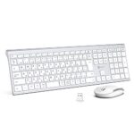 iCleverのワイヤレスキーボードマウスセット。静音、超薄型、フルサイズJIS配列。Type-C充電、テンキー付き。マウスは3段DPI調整可。無線2.4G接続、PC/Mac対応。カラーはシルバーホワイト。