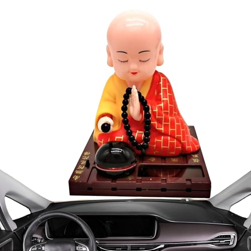 かわいい小さな僧侶のソーラーフィギュア。首振り人形で、木魚を叩く姿が愛らしい。車のダッシュボードに最適なオーナメント。