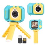 Andoer 1080Pキッズデジタルカメラは、48MPの解像度、2.4インチIPSスクリーン、デュアルレンズを搭載。内蔵バッテリー、32GBメモリーカード、カードリーダー、デスクトップ三脚付き。ブルーのデザインが魅力的。