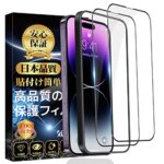 iPhone 14 Pro用の全面保護ガラスフィルム。旭硝子素材製で硬度9H、指紋防止、撥水・撥油加工。ガイド枠付き、2枚入りで簡単貼り付け、気泡ゼロを実現。
