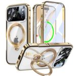iPhone 17 Pro Max 用の両面MagSafe対応ケース。ゼンマイ式スタンドで90°自立、360°回転可能。全面保護、ガラスCD紋リングスタンド、ワイヤレス充電対応。金属ボタン、カメラレンズ保護付き。