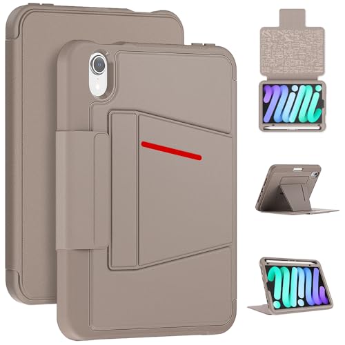 iPad mini 7/6世代用の強磁力カバー。ペン収納とワイヤレス充電対応。6角度スタンド、オートスリープ機能付き。PUレザー製で耐衝撃・指紋防止。全面保護のブラウンケース。