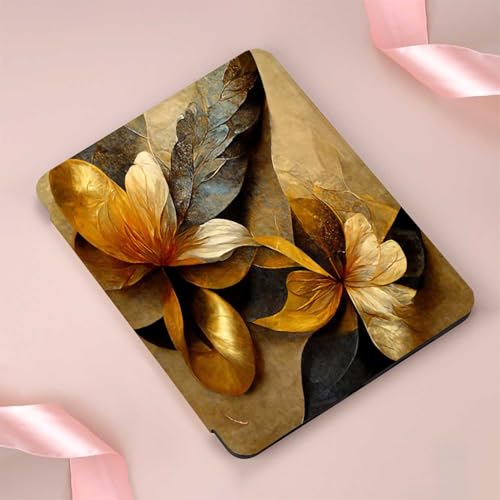 2024年モデルのiPad Air 11インチ(M2)専用ケース。オートスリープ、三つ折りデザイン。金・黒・黄の抽象花柄、水彩画風壁紙デザイン。