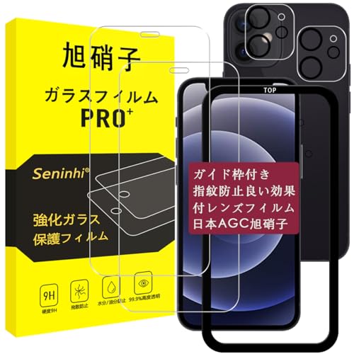 iPhone 12 Mini用のガラスフィルム。2枚の強化ガラスとレンズ保護、ガイド枠付き。指紋防止、硬度9H、耐衝撃、気泡ゼロで簡単貼り付け。超薄型で高質感のラウンドエッジ加工。