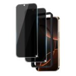 SlankuのiPhone 13 Pro用覗き見防止ガラスフィルム2枚セット。極薄で耐衝撃、指紋防止機能付き。自動吸着で貼りやすく、飛散防止と全面保護を実現。ガイド枠付きで簡単貼り付け。