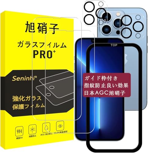 iPhone 13 Pro Max対応のガラスフィルム2枚セット。硬度9Hで耐衝撃、指紋防止機能付き。レンズ保護フィルム2枚、ガイド枠付きで貼り付け簡単。気泡ゼロ、自動吸着、ラウンドエッジ加工の超薄型。