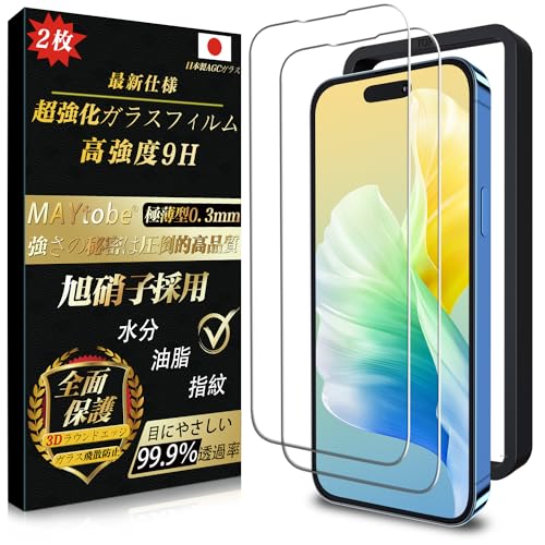 旭硝子製のMAYtobeガラスフィルムは、iPhone 14 Pro Max用で、全面保護・強化ガラス・硬度9H・超耐久・99%高透過率。3D Touch対応、耐衝撃、指紋防止・飛散防止・撥水撥油、自動吸着で簡単貼付。ガイド枠付き。