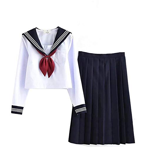 Aculldoの白いセーラー服3点セット。長袖上着、半袖上着、ロングスカートとネクタイ付き。可愛いデザインで女子高生風、文化祭やパーティーに最適。大きいサイズもあり、上質な制服コスプレにぴったりです。