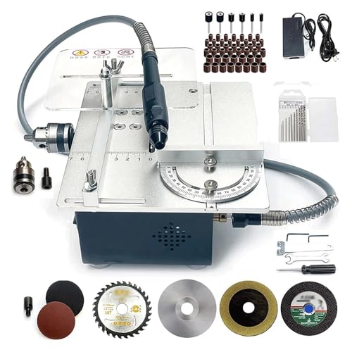 ミニテーブルソーは、7段変速、0-90°角度調節、0-30mm鋸刃昇降機能を備えた小型DIY切断機。木材、PCB、アクリル、プラスチック、金属の切断・研磨・彫刻が可能で、鋸刃4枚付き。