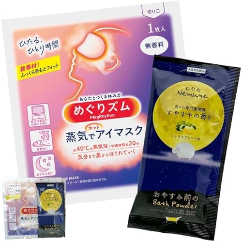 新しいおやすみ前のリラックスセット。シトラスブレンドの香りが楽しめる入浴剤と、めぐりズムの蒸気でアイマスクが含まれています。景品や粗品、ギフトにも最適です。