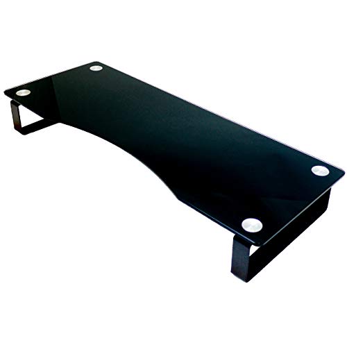 hABa モニタースタンドは、強化ガラス製のクリアブラックデザイン。56cm×21cmサイズで、モニターやプリンタの設置に最適。キーボード収納可能で、机上のスペースを有効活用します。