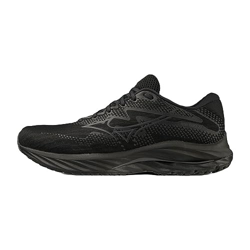 ミズノのウエーブライダー27は、軽量で反発性に優れた厚底のランニングシューズ。ジョギングやマラソンに最適で、メンズ用ブラック/ブラック、サイズ25.0 cm、4E幅です。