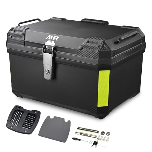 AHRのバイク用リアボックスは65Lの大容量。軽量で防水・防塵仕様、耐衝撃性にも優れています。反射シール、バックレスト付き、鍵2本、防犯対策。フルフェイス2個収納可能。キャンプやツーリングに最適な汎用品。