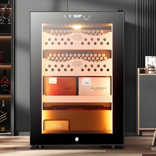 電気シガーキャビネットは50Lの容量で、湿度調整機能を備え、最大300本の葉巻を収納可能。デュアルコア冷凍機により一定温度を維持し、最適な環境で葉巻を保管します。