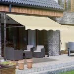オーニングテントは、つっぱり式で簡単に設置でき、穴を開ける必要がありません。幅3mのオフホワイトの防水シートで、UVカット機能付き。日よけやサンシェードに最適です。