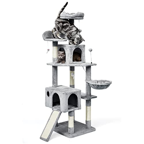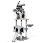 AIFYキャットタワーは、170cmの省スペース設計で大型から子猫まで対応。ハンモックやおもちゃ付きで多頭飼いに最適。安定性と頑丈さを兼ね備えたおしゃれなグレーの爪とぎ付きです。