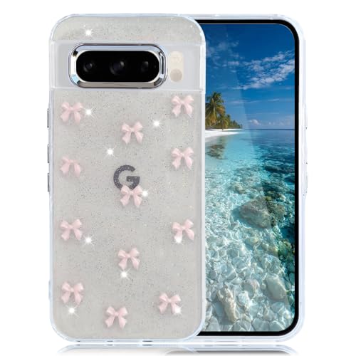 JOOBOYのGoogle Pixel 9a対応スマホケース。クリアでキラキラしたリボンデザイン、TPU素材で傷防止。滑り止めと衝撃吸収機能付き。