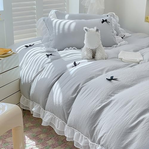 姫系デザインのダブル寝具カバーセット。掛け布団カバー、ベッドシーツ、枕カバーを含む4点セット。フリルやレースが特徴で、プリンセスのようなおしゃれなインテリアにぴったり。グレー色で、固定ヒモ付きのファスナー仕様。