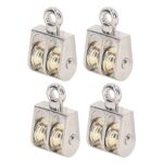 ダブルスイベル式クライミングプーリー、亜鉛合金製で耐荷重100kg。室内外で使用可能。サイズ約36x22x13.5mm、4個入り。建設工事や貨物輸送に最適。