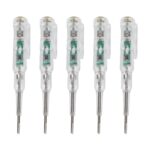 低電圧用の検電ドライバーで、70-250Vの電圧を測定可能。ペン型で使いやすく、インジケーターライトと高輝度LEDランプ内蔵。クリップ付きで便利な5pcsセット。