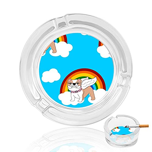 滑り止めの透明なガラス製の丸い灰皿。喫煙者のホームオフィスや庭の装飾として最適。『すべてのブルドッグは天国に行きます』のデザインが特徴的。ギフトにも最適。