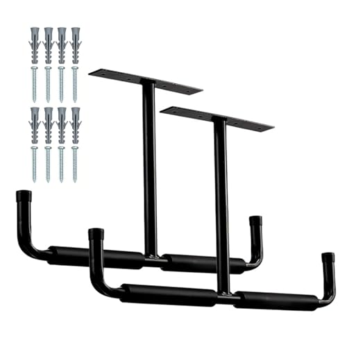 頑丈なスチール製の天井ハンガー、はしごフックなどを備えたガレージ保管システム。バイクや機器の収納に最適で、パイプや木材、釣り竿、スキーにも対応。2個セット。