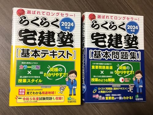 2024年版 らくらく宅建塾 基本問題集・基本テキストのセット。宅建資格の基礎から応用までを網羅したドリルと参考書で、独学にも最適。効率よく学べる問題集です。