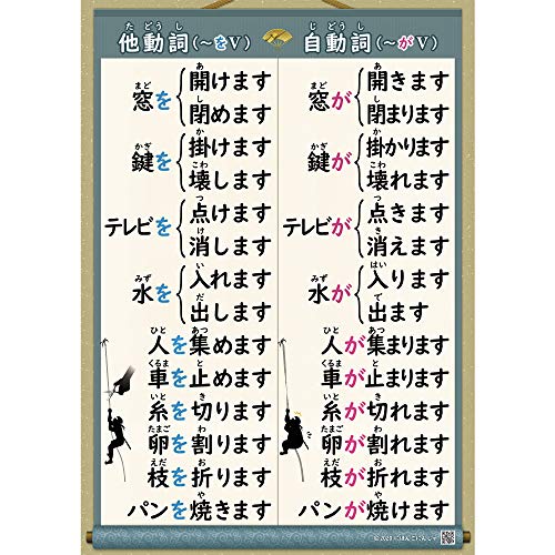 自動詞と他動詞を理解するためのポスターです。JLPTや日本語教育に役立ち、留学生や外国ルーツの学習者に最適です。使いやすく、視覚的に学べるデザインです。日本語の基礎をしっかりサポートします。