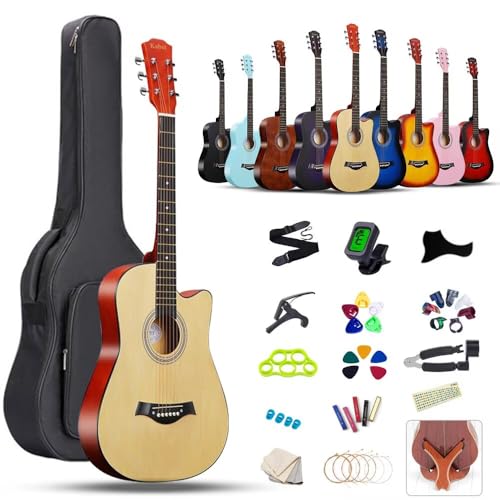 アコースティックギター初心者向け38インチセット。入門用ギター、弦、チューナー、スタンド、ソフトケース、簡易教則が含まれ、学生や子供、大人に最適です。