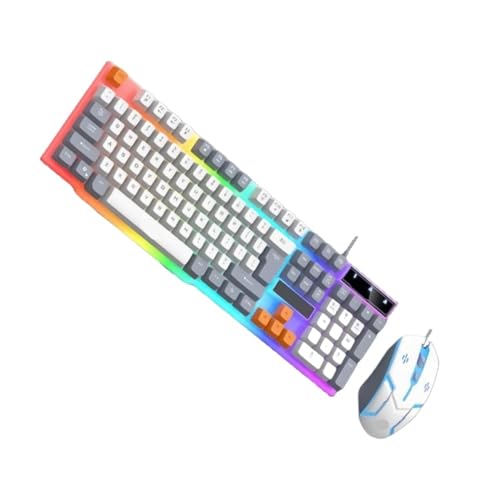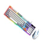 LEDバックライト付きのUSB接続メカニカルフィーリングゲーミングキーボードとマウスのセット。ホワイトカラーで、マルチメディア機能も搭載。