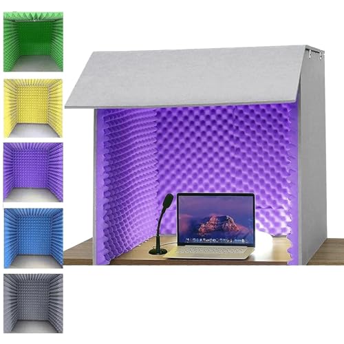 80x80x80cmの簡易防音室はカラオケや歌練習に最適。組み立て式の小型卓上吸音ボックスで、自宅用や録音・会議・放送用に便利。折りたたみ式で、騒音カット効果もあり。紫色のデザインが特徴。