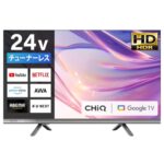 チューナーレスの24型スマートテレビ。HDR対応、Googleテレビ、Bluetooth、Googleアシスタント搭載。HDMI2系統、YouTube、Prime Video対応。モデル名: JL24M10GP CHiQ。