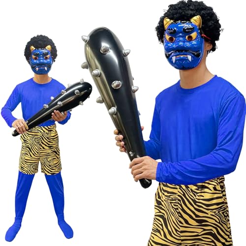 節分用の鬼コスプレセット。赤鬼、青鬼の全身タイツ、鬼のお面、虎柄パンツ、こん棒が含まれる6点セット。豆まきや仮装イベントに最適。Mサイズの青い鬼デザイン。