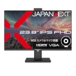 JAPANNEXT 23.8インチIPSパネル搭載のフルHD液晶モニター。解像度1920×1080、sRGBカバー率100%。HDMI/VGA接続、Webカメラとマイク内蔵。2年保証付き。