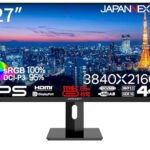 JAPANNEXT 27インチ 4K IPSモニター。HDMI, DP, USB Type-C(最大65W給電)対応。sRGB:100%、DCI-P3:95%。HDR、高さ調整、ピボット、KVM機能搭載。2年保証。