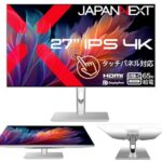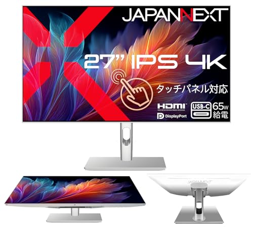 JAPANNEXTの27インチIPSモニターは、4K解像度、10点マルチタッチ、sRGB100%、DCI-P3 95%、HDR対応。HDMI、DP、USB-C接続可能で、最大65W給電、フォルダブルスタンド付。2年保証。