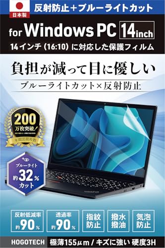 HOGOTECHのブルーライトカットアンチグレア保護フィルムは、14インチWindowsノート用で、縦189mm×横302mmのサイズ。反射防止と気泡防止機能を備え、目を守ります。