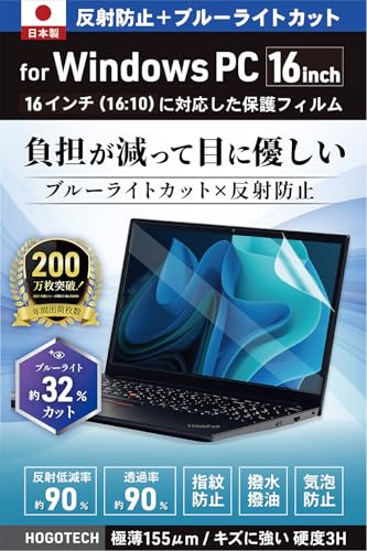HOGOTECHのブルーライトカットアンチグレア保護フィルムは、16インチ16:10のWindows用。サイズは215mm x 345mmで、反射防止、気泡防止機能付き。視界を快適に保ちます。